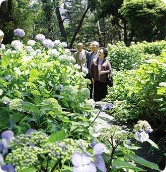 御用邸記念公園の正面門、西付属邸の周辺を中心にガクアジサイ・ヤマアジサイ・西洋アジサイ等の約2,300株ものアジサイが咲き誇り、シーズンには来園者の目を楽しませてくれます。