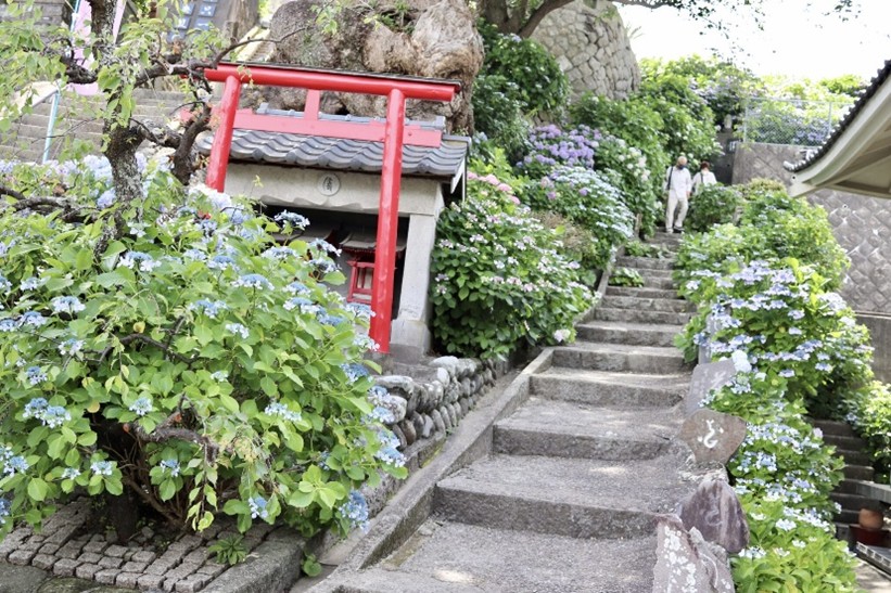 沼津市江の浦にたたずむ古刹、照江寺では、境内の石畳や山の斜面を埋め尽くすのは、住職が丹精込めて育ててきた色とりどりのあじさい。